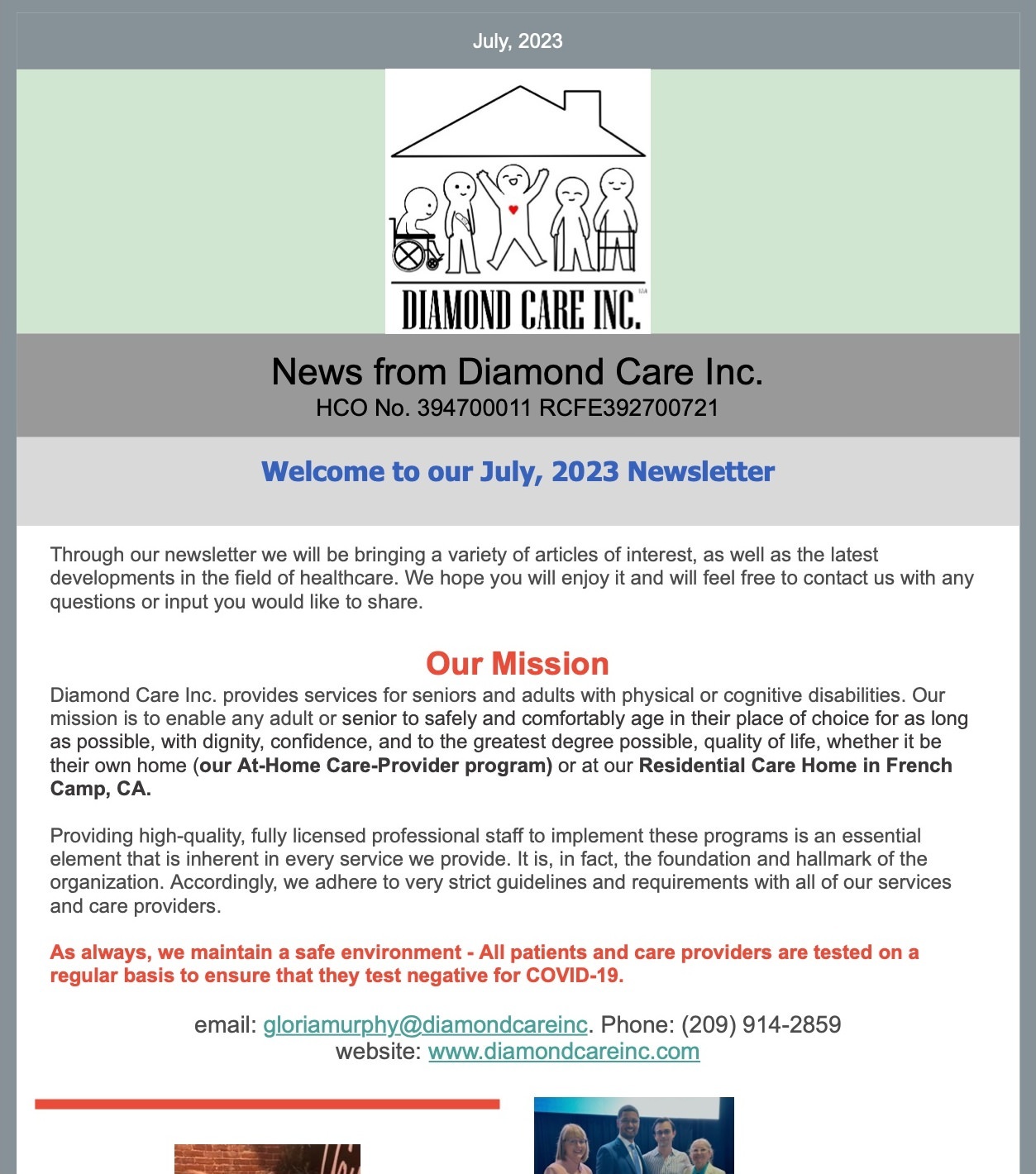 Diamond Care Inc. is Licensed through the Department of Social Services, Community Care Licensing Department – RCFE 392700721 / HCO 394700011